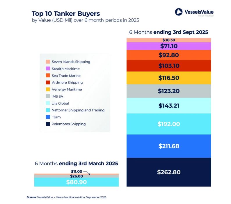 Χρησιμοποιώντας δεδομένα της VesselsValue, η αναλύτρια Rebecca Galanopoulos της Veson Nautical κατέγραψε τους κορυφαίους αγοραστές τάνκερ από τον Μάρτιο έως τις 3 Σεπτεμβρίου 2026.