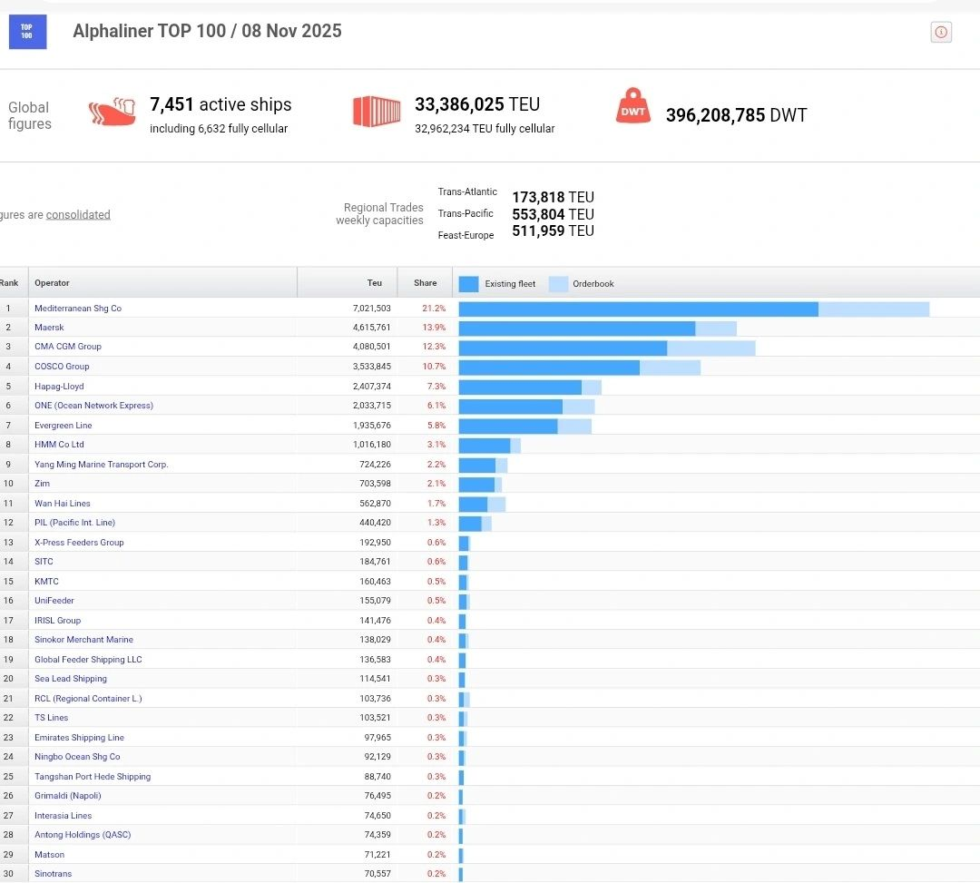 Σύμφωνα με τα τελευταία στοιχεία της Alphaliner (4 Νοεμβρίου 2025), η MSC Mediterranean Shipping Company (MSC), του Τζιανλουίτζι Απόντε, έγινε η πρώτη εταιρεία τακτικών γραμμών στην ιστορία που ξεπέρασε το ορόσημο χωρητικότητας των 7 εκατομμυρίων TEU.