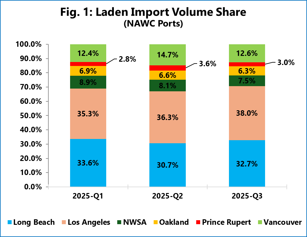 Figure 1 shows how this divergent performance impacted each port’s share of the total NAWC laden import volumes through the first three quarters of 2025. The data reveals a significant consolidation of market share within the San Pedro Bay port complex, which in aggregate grew from 68.9% of NAWC laden imports in 2025-Q1 to 70.7% in 2025-Q3.