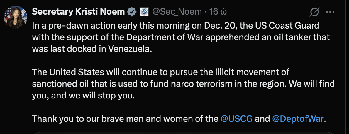 Noem said the tanker was involved in the illicit transport of sanctioned oil. She stated that the United States will continue to target oil shipments used to fund narco-terrorism in the region.