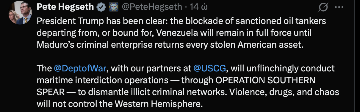 Defense Secretary Pete Hegseth said the operation supports President Trump’s order for a “total and complete blockade” of sanctioned oil tankers traveling to or from Venezuela. Trump announced the blockade earlier this month. He said it will remain in place until Venezuela returns what he described as stolen U.S. assets.