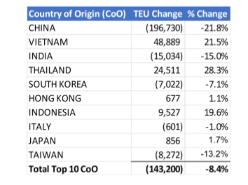 Looking at top countries of origin, China drove most of the year-over-year decline. Other drops came from India (-15%), Taiwan (-13.2%), South Korea (-7.1%), and Italy (-1%). Southeast Asian countries posted gains, including Thailand (+28.3%), Vietnam (+21.5%), and Indonesia (+19.6%). Japan and Hong Kong showed smaller increases.