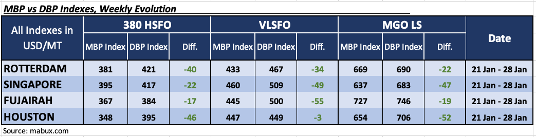 • VLSFO segment: The MDI remained unchanged in Rotterdam and Fujairah, while declining by 6 points in Singapore and 4 points in Houston. Notably, the Houston MDI remains close to the 100% parity level between MBP and DBP.