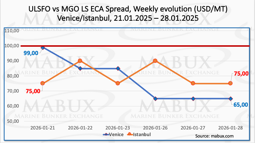 By the end of the week, the Istanbul ECA Spread (ES) remained unchanged at US$ 75.00, despite reaching US$ 90.00 earlier in the week. At the same time, the weekly average value of the index increased by US$ 20.83. In Venice, the ECA Spread continued to narrow, declining by US$ 34.00 from US$ 99.00 to US$ 65.00, while the weekly average value decreased by US$ 15.67. Overall, ES dynamics in both ports remain downward, with spreads consolidating in the US$ 75.00–65.00 range. This movement occurred against a backdrop of rising ULSFO prices, driven by a slight reduction in regional supply and, consequently, tighter market availability. Meanwhile, MGO prices remained relatively stable, supported by more balanced supply–demand fundamentals. ”We believe that as ULSFO supply increases, ECA Spread values are likely to stabilize again around the US$ 100.00 level”, commented Sergey Ivanov.