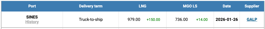 The price of LNG as a bunker fuel at the port of Sines (Portugal) continued its sharp upward trajectory this week, rising by a further US$ 150.00 to US$ 979/MT, compared with US$ 829/MT last week. As a result, the price differential between LNG and conventional fuel widened to US$ 243 in favor of conventional fuel. MGO LS was assessed at US$ 736/MT at the port of Sines on January 26.