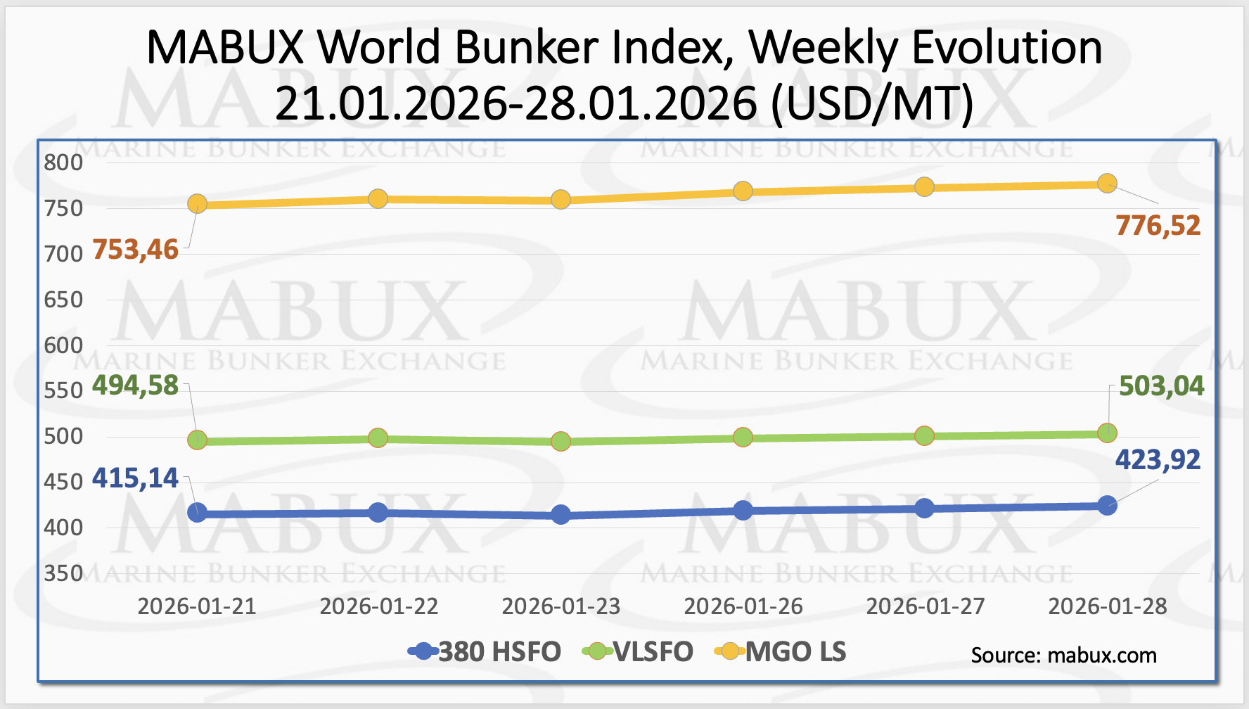 Following the results of the 5th week, global bunker indices published by MABUX continued their upward trajectory. The 380 HSFO index increased by US$ 8.78, rising from US$ 415.14/MT last week to US$ 423.92/MT. The VLSFO index gained US$ 8.46, climbing from US$ 494.58/MT to US$ 503.04/MT and once again surpassing the US$ 500/MT threshold.