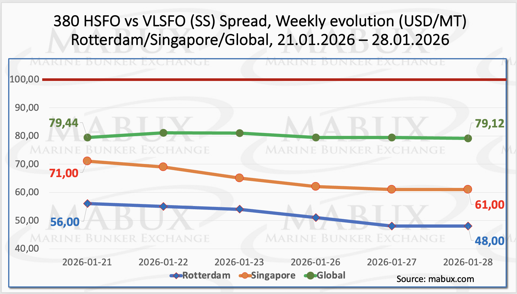 The MABUX Global Scrubber Spread (SS)—defined as the price differential between 380 HSFO and VLSFO—continued to narrow, declining by US$ 0.32 from US$ 79.44 last week to US$ 79.12. The spread remains firmly below the psychological threshold of US$ 100.00 (SS breakeven), while the weekly average value of the index decreased by US$ 1.27. In Rotterdam, the SS Spread also contracted by US$ 8.00, falling from US$ 56.00 last week to US$ 48.00 and dropping below the US$ 50.00 level. The port’s weekly average SS value declined by US$ 5.67.