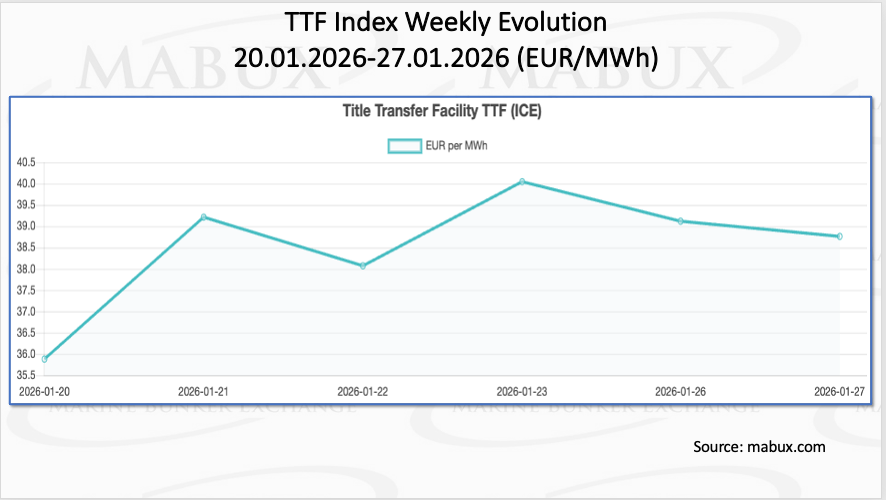 As of January 27, European regional gas storage facilities were filled to 44.23%, down by 4.89 percentage points from the previous week. Gas withdrawals accelerated in January amid colder-than-usual weather across most European countries, with withdrawal rates reaching their highest level over the past five years. At the same time, storage levels are already 17.23 percentage points below those recorded on January 1, 2026 (61.46%). By the end of week 5, the European TTF gas benchmark continued its upward trend, increasing by €2.574/MWh to €38.761/MWh from €35.887/MWh last week, temporarily exceeding the €40.000/MWh threshold.
