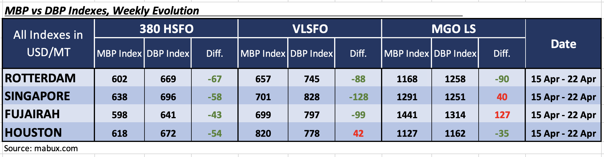 Amid the ongoing geopolitical tensions in the Middle East, the MABUX Market Differential Index (MDI)—reflecting the ratio between market bunker prices (MBP) and the MABUX digital bunker benchmark (DBP)—continued to display mixed dynamics across Rotterdam, Singapore, Fujairah, and Houston: