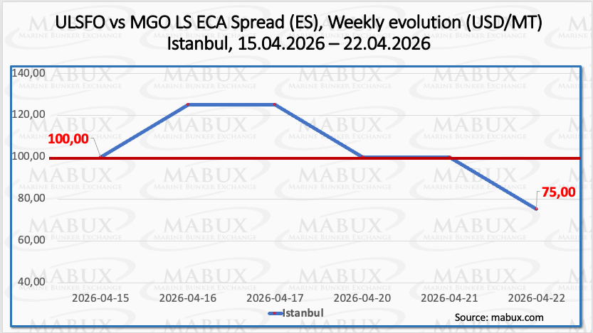 The Istanbul ECA Spread (ES) declined by US$ 25.00 over the week, falling from US$ 100.00 to US$ 75.00 by the close of the reporting period. Despite this net decrease, the index exhibited pronounced intra-week volatility, fluctuating within a wide range of US$ 75–125. The weekly average, however, increased by US$ 8.34. The calculation of the Venice ECA Spread remains temporarily suspended due to the absence of consistent market quotations.