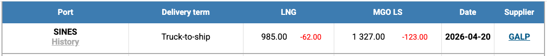 The price of LNG as a bunker fuel at the port of Sines (Portugal) continued its downward trend, declining by a further US$ 62.00 over the week to US$ 985/MT, compared to US$ 1,047/MT the previous week. At the same time, the price differential between LNG and conventional marine fuel continued to narrow, reaching US$ 342 in favor of LNG, down from US$ 440 a week earlier. As of April 20, MGO LS at the port of Sines was quoted at US$ 1,327/MT.