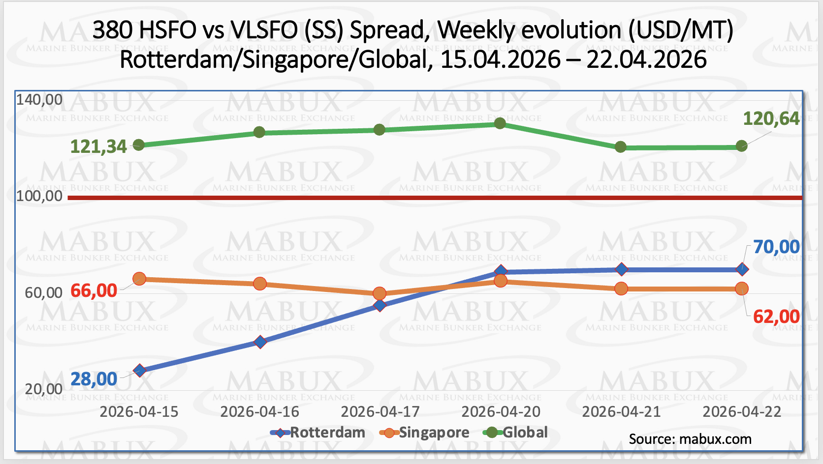 The MABUX Global Scrubber Spread (SS), representing the price differential between 380 HSFO and VLSFO, remained largely stable over the week, declining marginally by US$ 0.70 from US$ 121.34 to US$ 120.64. The index continues to hold firmly above the key psychological threshold of US$ 100.00 (SS Breakeven). Meanwhile, the weekly average of the SS index posted a slight increase of US$ 0.18, indicating relative stability on a broader basis. In Rotterdam, the SS Spread recorded a notable upward movement, rising sharply by US$ 42.00 from US$ 28.00 to US$ 70.00, thus moving closer to the US$ 100.00 breakeven level. The port’s weekly average SS Spread also increased significantly by US$ 26.00. Conversely, in Singapore, the 380 HSFO/VLSFO spread continued to narrow, decreasing by US$ 4.00 from US$ 66.00 to US$ 62.00. The weekly average in Singapore also declined substantially by US$ 35.16.