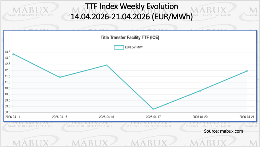 As of April 21, the level of natural gas in European underground storage facilities continued to show a modest increase, reaching 30.61% of total capacity, up by 1.06 percentage points compared to the previous week. However, current storage levels remain significantly lower than at the beginning of the year, standing 29.55 percentage points below the 61.46% recorded on January 1, 2026. At the same time, the European gas benchmark TTF extended its downward trend by the end of week 17, declining by 1,434 euros/MWh to 41,931 euros/MWh, compared to 43,365 euros/MWh the previous week.